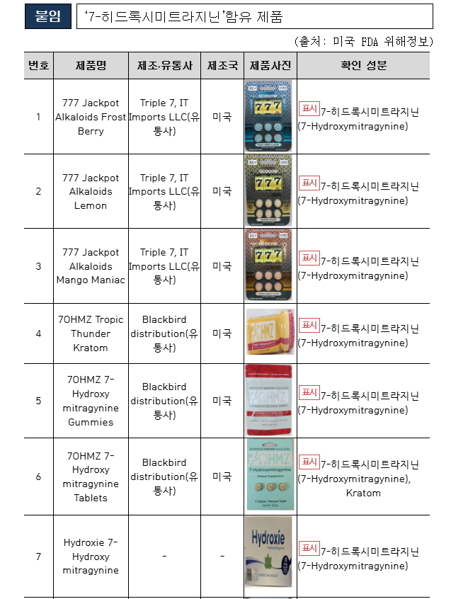 식품의약품안전처(처장 오유경)는 향정신성의약품 성분인 ‘7-히드록시미트라지닌(7-Hydroxymitragynine)’이 함유된 식이보충제·젤리·음료믹스 등 제품의 국내 반입을 전면 차단한다고 24일 밝혔다.