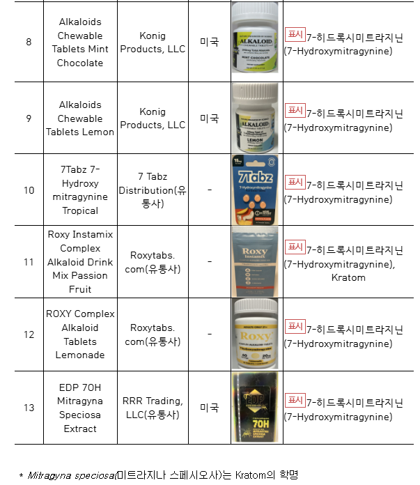 해당 성분은 동남아시아에서 ‘크라톰(Kratom)’이라는 이름으로 알려진 식물 **미트라지나 스페시오사(Mitragyna speciosa)**에 미량 포함돼 있으며, 강한 중추신경계 작용으로 심각한 중독성과 의존성을 유발할 수 있는 물질로 알려져 있다. 이에 따라 2021년 이미 「마약류 관리에 관한 법률」에 따른 향정신성의약품으로 지정된 바 있다.